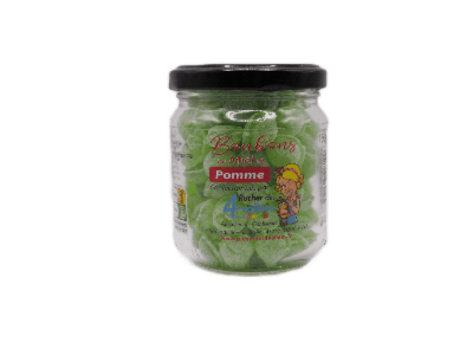 Ingrédients : sucre, glucose de blé, miel 15%, arôme pomme verte, colorant vert.